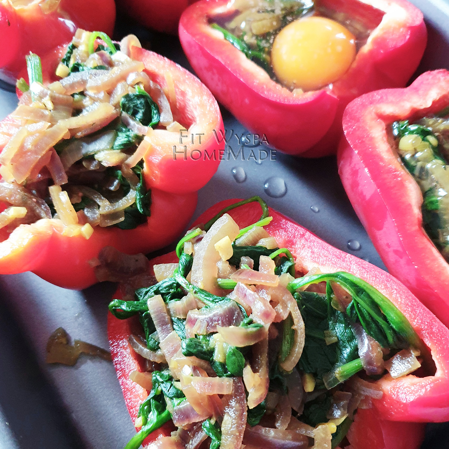 Poszatkowane cebule dusimy z rozdrobnionym czosnkiem i przyprawami na oleju. Pod koniec dodajemy umyte liście szpinaku – i mamy gotowy farsz. W wersji z pieczarkami dusimy farsz nieco dłużej. Papryki, po umyciu dzielimy na połówki lub odkrajamy górne części z łodygą i wydrążamy. Układamy na blaszce i wypełniamy farszem. Do trzech (lub do wszystkich) wbijamy jajko. Podlewamy niewielką ilością wody, by papryki nie przywarły do blachy.